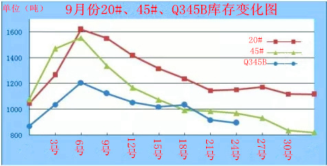 如下圖所示:9月份聊城無縫管廠家20#、45#、Q345B等材質庫存均有不同程度下降,從圖中可以看出,從9月6號以后203、45#廠家庫存下降明顯,Q345B下降幅度趨緩;而20#、45#現貨庫存下降并沒有帶來價格上漲,至9月中旬無縫管價格降幅10元/噸,Q345B成交價格降上個月變化不大,聊城市場報價弱穩,成交不暢,9月24號以后在沒有新資源到貨。